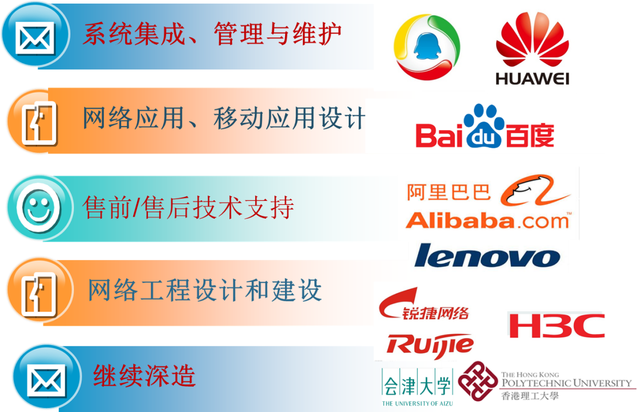 网络工程专业在就业方面一贯保证了稳定且高质量,近四年,本专业毕业生一次就业率近100%,近40%毕业生攻读研究生和出国深造。本专业毕业生就业范围包括腾讯、百度、阿里巴巴、华为、联想、锐捷、新华三、瓜子等著名互联网及信息技术公司,平均年薪近12万(2019年数据)。毕业生薪资水平连续多年保持增长并位居前列。为我校所有本科专业中,平均起薪最高,就业率、就业专业对口率等指标长年名列前茅的优质专业之一。