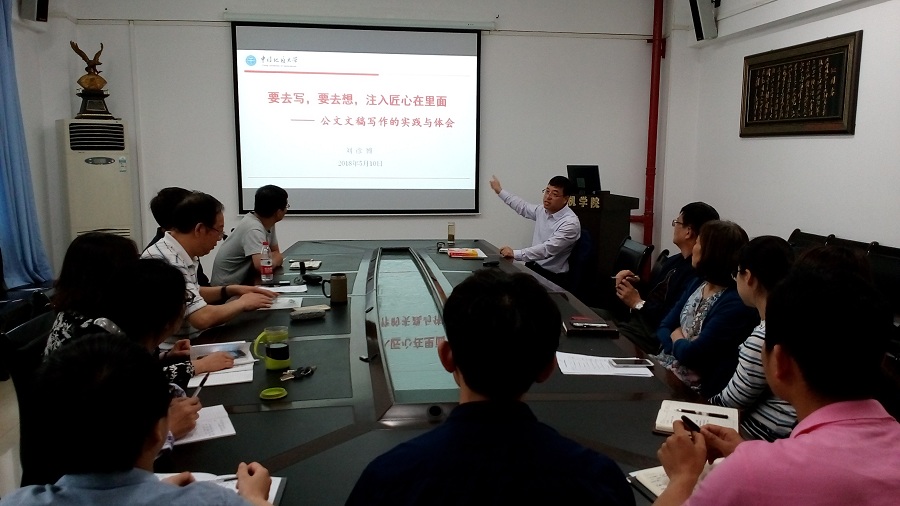 刘彦博同志分别从“公文处理”、“文字文稿”、“个人体会”三个方面为大家详细讲授了公文文稿的写作技巧、注意事项、锻炼途径。他说,要想写好公文文稿需要去写、去想,把文稿当成一件艺术品,注入匠心。同时要非常注重平时的积累、不断的学习,以开拓自己的写作思路,提高自己的思想认识。鉴于公文的重要性,还需要行文依据准确、处理程序规范、支撑材料完备等等。刘老师还分别以起标题、拟计划、写总结、发通讯、记纪要等诸多实际工作中会遇到的公文写作体裁为例,列举了大量翔实的案例详细剖析了公文写作的规范,和自己是怎样思考、怎样动笔的。