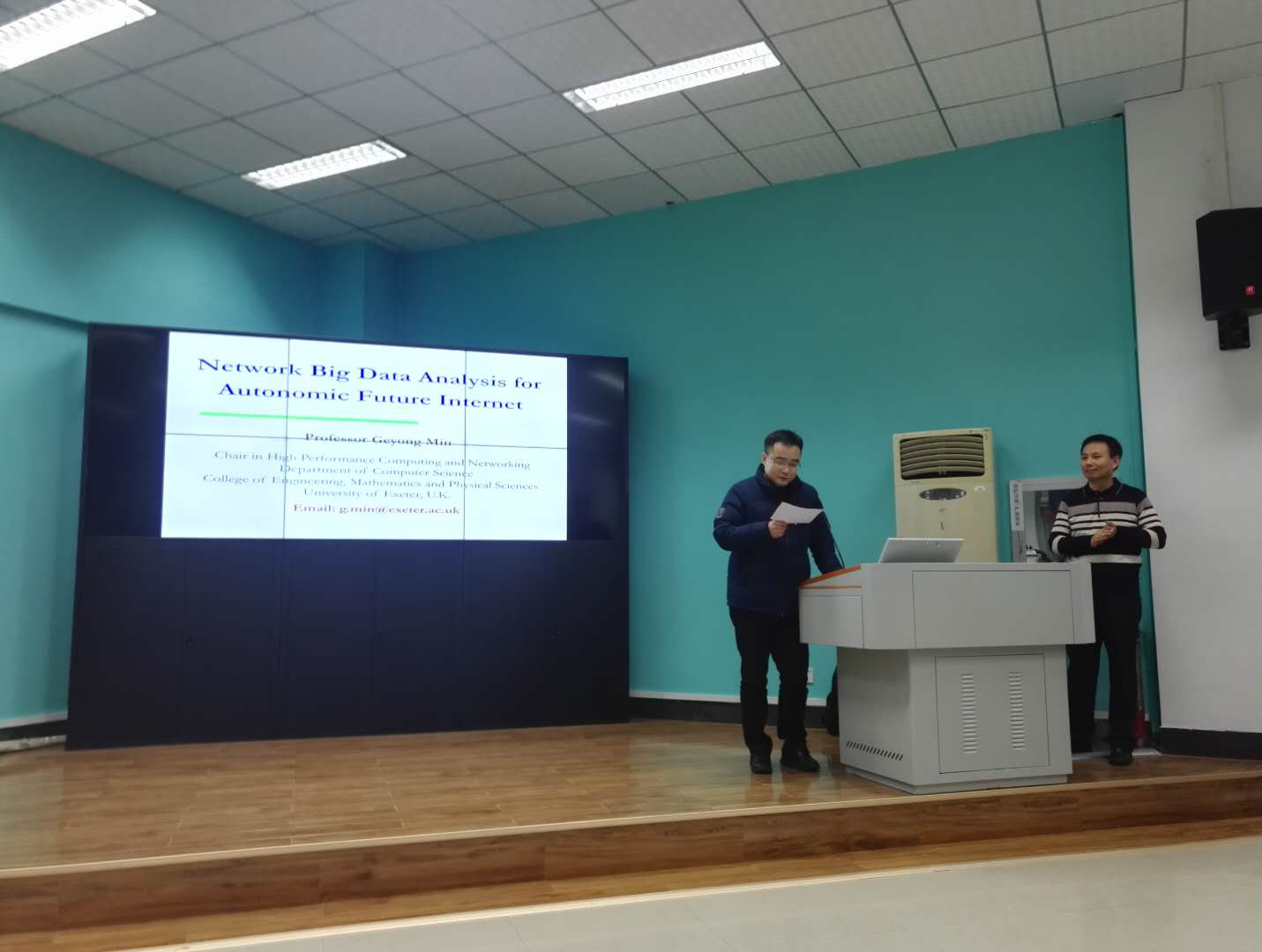 1月2日,应世界杯体育官方网站院长王力哲教授的邀请,英国Exeter大学(计算机学科首席教授)闵革勇教授来院访问,并做了题为“Network Big Data Analysis for Future Intelligent Internet”的学术报告。闵革勇教授在计算机/通信学科的IEEE与ACM国际顶级期刊上发表学术论文140余篇,多次获得会议最佳论文奖,现任6个国际期刊的编委(含计算机学科顶级国际期刊IEEE Transactions on Computers),18个国际期刊专刊的编辑,先后担任了18个国际会议/研讨会的大会主席和程序委员会主席,80多个国际学术会议的程序委员会委员,并在多个国际学术会议与研讨会上做大会特邀主题报告。学术报告在王力哲教授的郑重介绍下正式开始。