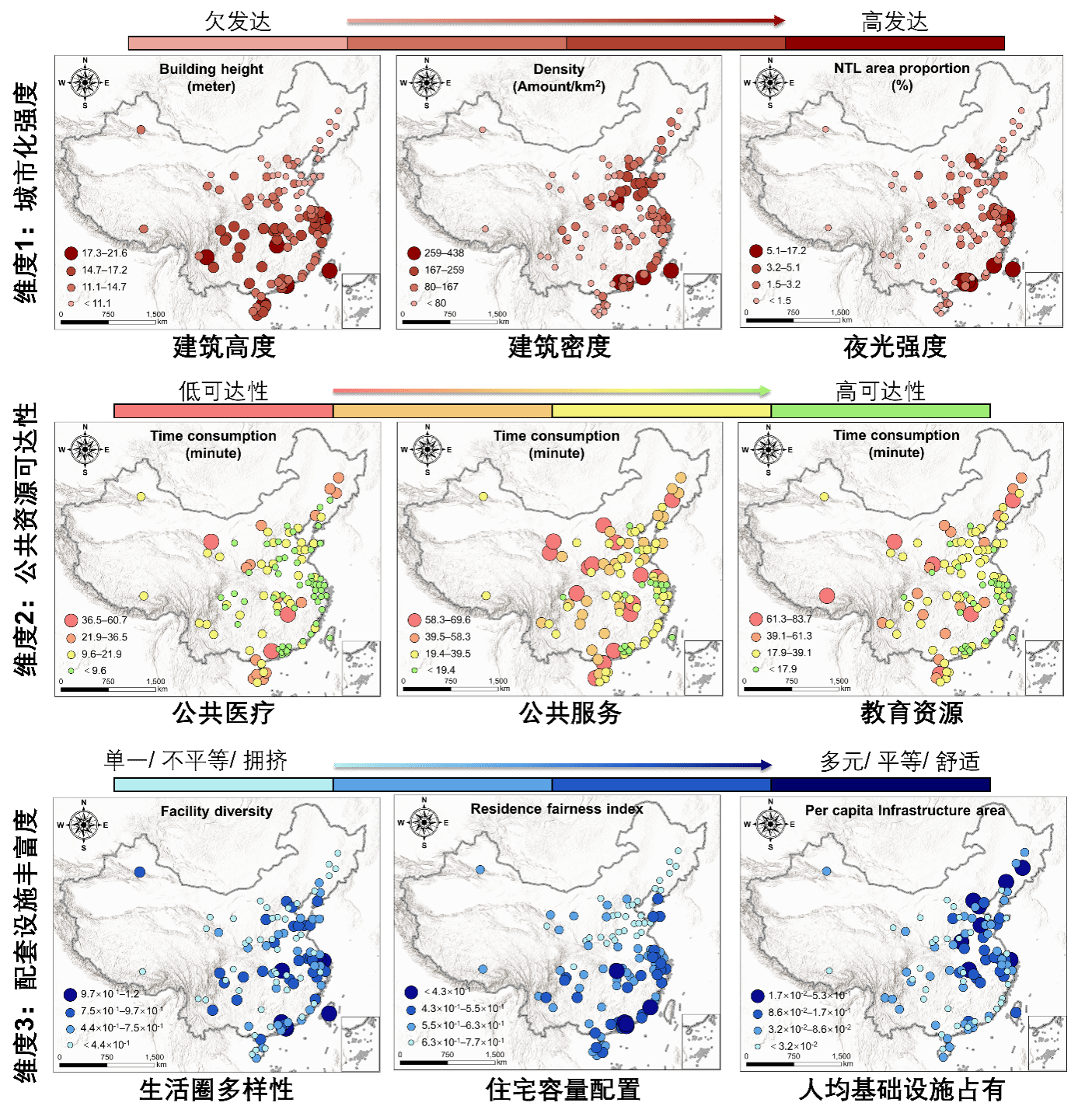 图4:多维度建成环境评估结果。(a) 维度1:城市化强度,包含建筑高度、建筑密度和夜光强度,反映城市发展水平及建筑聚集程度。(b) 维度2:公共资源可达性,反映每栋住宅到其最近的教育、医疗和社区服务设施的驾车时间。(c) 维度3:配套设施丰富度,反映建成环境的配套设施多样性和丰富度