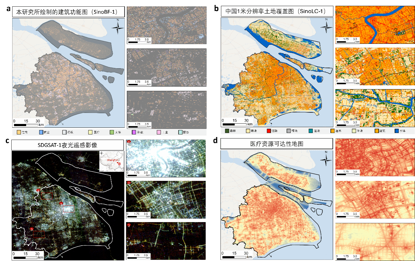 图3:(a)本研究绘制的建筑功能图(SinoBF-1);(b)团队23年绘制的1 米土地覆盖图(SinoLC-1);(c)夜光遥感影像(SGDSAT-1);(d)本研究结合建筑功能图、路网数据、土地覆盖图生成的上海医疗设施可达性地图