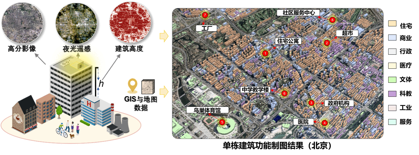 城市是人类生产与生活活动最重要的空间载体。过去几十年间,我国经历了全球范围内规模最大、速度最快的城市化进程,城市化水平水平显著提升。精细尺度的建筑功能、建成环境研究能够揭示不同功能建筑的空间分布特性与规律,事关城市居民的生活幸福感,是城市地理学国际研究前沿。对此,本研究首先构建了有限标签条件下的大范围楼栋尺度建筑功能制图模型,综合1米光学遥感数据、10米建筑高度数据和10米夜间灯光数据的互补信息,通过处理69TB的多模态卫星遥感数据、自发地理信息数据,研制了全国109个城市、1.1亿栋建筑楼栋尺度的建筑功能专题图SinoBF-1。