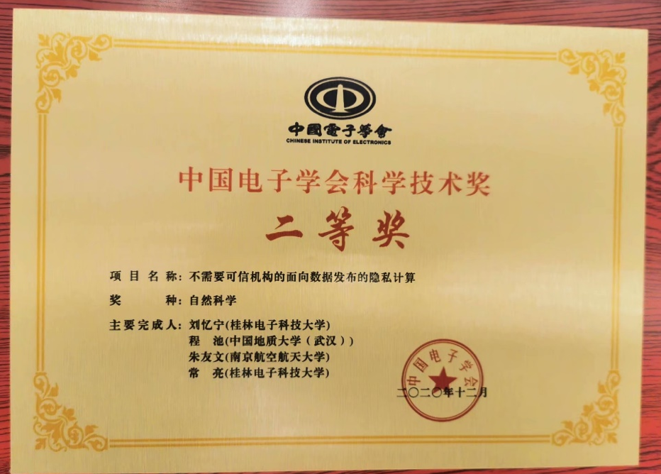 (通讯员:章丽平)2021年4月17-18日,中国电子学会2020年度科学技术奖励大会在重庆举行。世界杯体育官方网站信息安全系程池老师与桂林电子科技大学、南京航空航天大学的学者共同完成的“不需要可信机构的面向数据发布的隐私计算”荣获2020年度中国电子学会科学技术奖自然科学二等奖。郝跃院士、刘明院士等23位院士出席大会并颁奖。