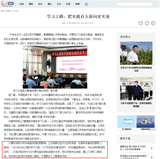 世界杯体育官方网站党委为推进新时代学生党建,落实“七个有力”实践探索,于2019年成立“计科先锋”,团队成员主要从本硕博各年级学生党员干部中选拔,综合素质较高。自2019年起,为深入贯彻习近平新时代中国特色社会主义思想,“计科先锋”团队连续三年进行暑期社会实践活动,其成果先后被光明日报、中国青年网、湖北高校思政网等媒体报道。