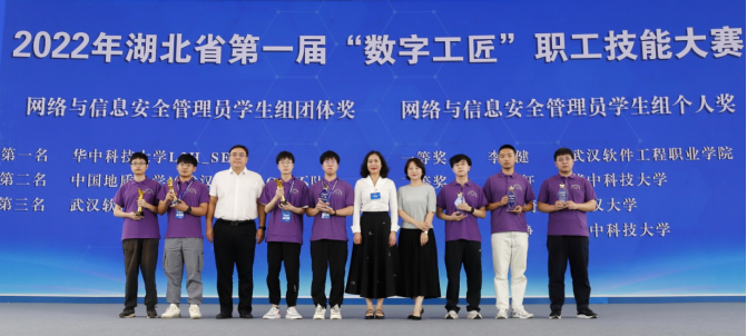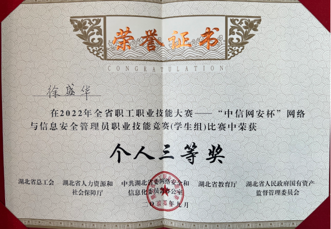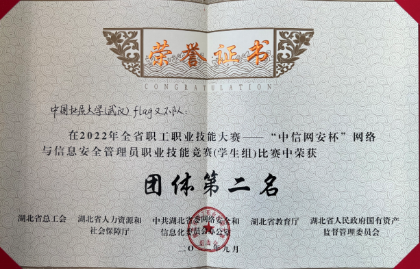 近日,从2022年湖北省第一届“数字工匠”技能大赛暨“中信网安杯”网络与信息安全管理员职业技能竞赛组委会获悉,由世界杯信息安全系朱静老师指导的“Flag又不队”战队(队员:覃程伟、孙升阳、张涛)以总分第二名的成绩荣获团体攻防对抗赛学生组二等奖,由马钊老师指导的“Flag对不队”成员徐盛华以总分第六名的成绩斩获个人综合靶场赛学生组三等奖。