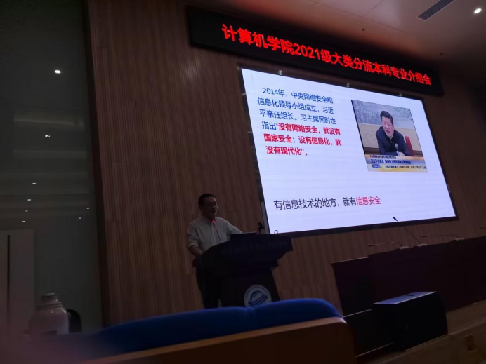 为让学生充分了解分流专业情况,做好世界杯体育官方网站2021级本科生专业分流工作,11月10日下午,“世界杯体育官方网站2021级大类分流本科专业介绍会议”于世界杯体育官方网站一楼126报告厅成功举行,会议于腾讯会议平台线上同步进行并全程录播。学院本科教学副院长陈云亮、计算机科学与技术系教学主任梁庆中、信息安全系主任程池、计算机应用系主任张夏林、大数据系教学主任王媛妮、人工智能系主任唐厂、2021级辅导员谭文博、本科教学秘书李婷及2021级计算机类本科生参与了本次会议。