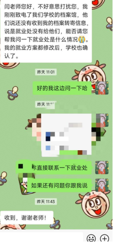 2023届本科毕业生辅导员闫维蓉在暑假期间仍心系未落实去向的学生,点对点关心未落实去向学生的动态。针对未就业学生,她积极了解学生目前的情况和就业中存在的困难,为学生提供招聘信息、推荐就业岗位;针对二战学生她关心同学复习进度,鼓励大家要树立信心,坚持到底。此外暑假期间她积极帮助同学们解决档案转接过程中遇到的各种问题。闫维蓉表示:“希望看到每一位19级同学都能找到满意的去处、有一个美好的未来”。