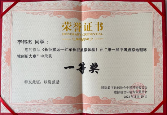 本次竞赛从2023年2月开始到作品提交结束,整个过程历时五个月。李伟杰等五名同学在邱芹军、刘郑和陶留锋三名老师的指导下,查阅了虚拟地理环境的文献资料,师生讨论确实赛道与选题并定期组织会议完成进度,对作品进行反复修改与完善,认真撰写项目实施方案,最终提交了出色的作品,通过专家初审评阅和现场汇报等环节的严格筛选,他们最终脱颖而出,荣获一等奖。他们的杰出表现展现了世界杯学子的才华,彰显了世界杯学子在学术和团队合作方面的卓越素养。