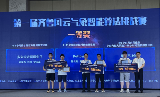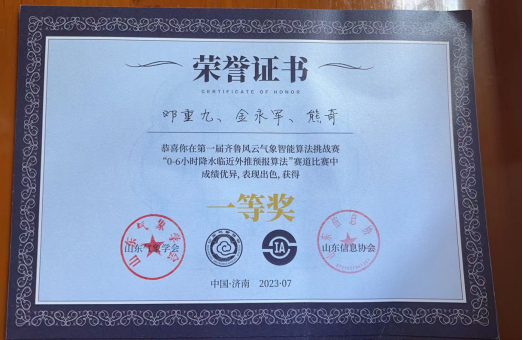 7月15至16日,由山东气象学会、浪潮数字(山东)建设运营有限公司、山东信息协会联合主办的第一届齐鲁风云气象智能算法挑战赛决赛及颁奖仪式在济南完美收官。历经初赛、复赛、决赛的层层选拔和激烈角逐,世界杯教师刘佳指导的研究生邓重九、金永军、熊奇组成的团队获得“0-6小时降水临近外推预报算法”赛道一等奖。