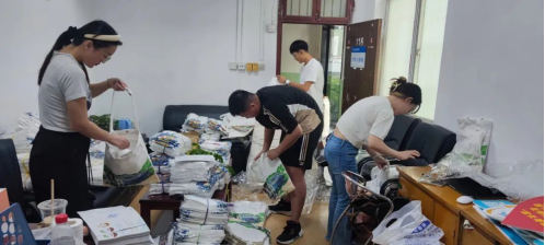 (辅导员闫维蓉和志愿者整理新生大礼包)