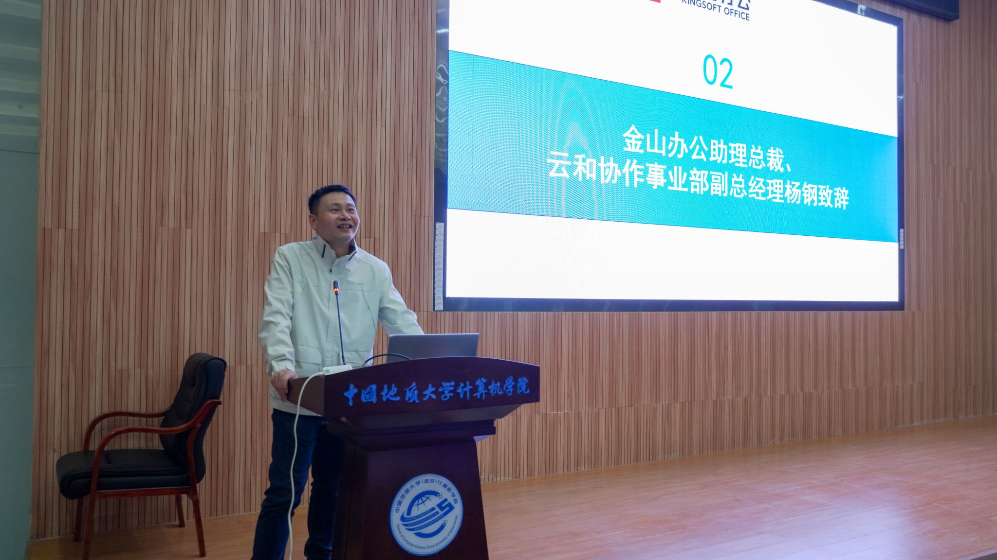 杨钢致辞。他表示金山办公非常注重技术和人才培养,致力于把互联网前沿技术带进高校。去年,两个单位联合申报的就业育人项目获教育部就业育人优秀案例,今年,我们也一如既往的提供高质量的学习资源和学习环境,将前沿的技术和真实的项目案例提供给同学们。期待和地大的合作更上一个台阶,