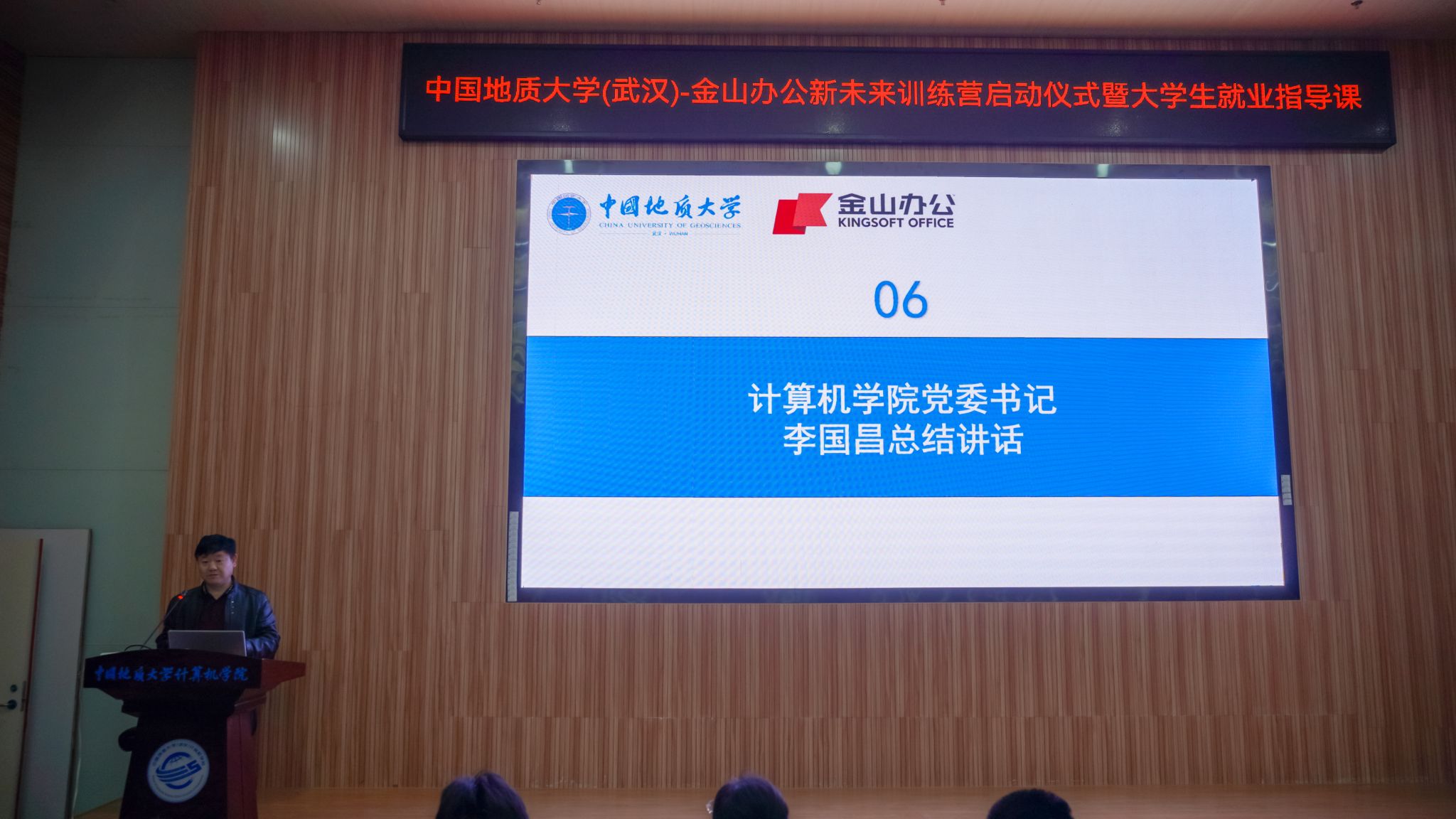 李国昌总结发言。他表示学院和金山办公的合作时间长、范围广、类型多、成果多。希望同学们认真学习,把握机会;希望金山办公擎起国内办公软件的大旗,以最优秀的师资将前沿技术嵌入到课堂中,助力一流信息人才的培养。