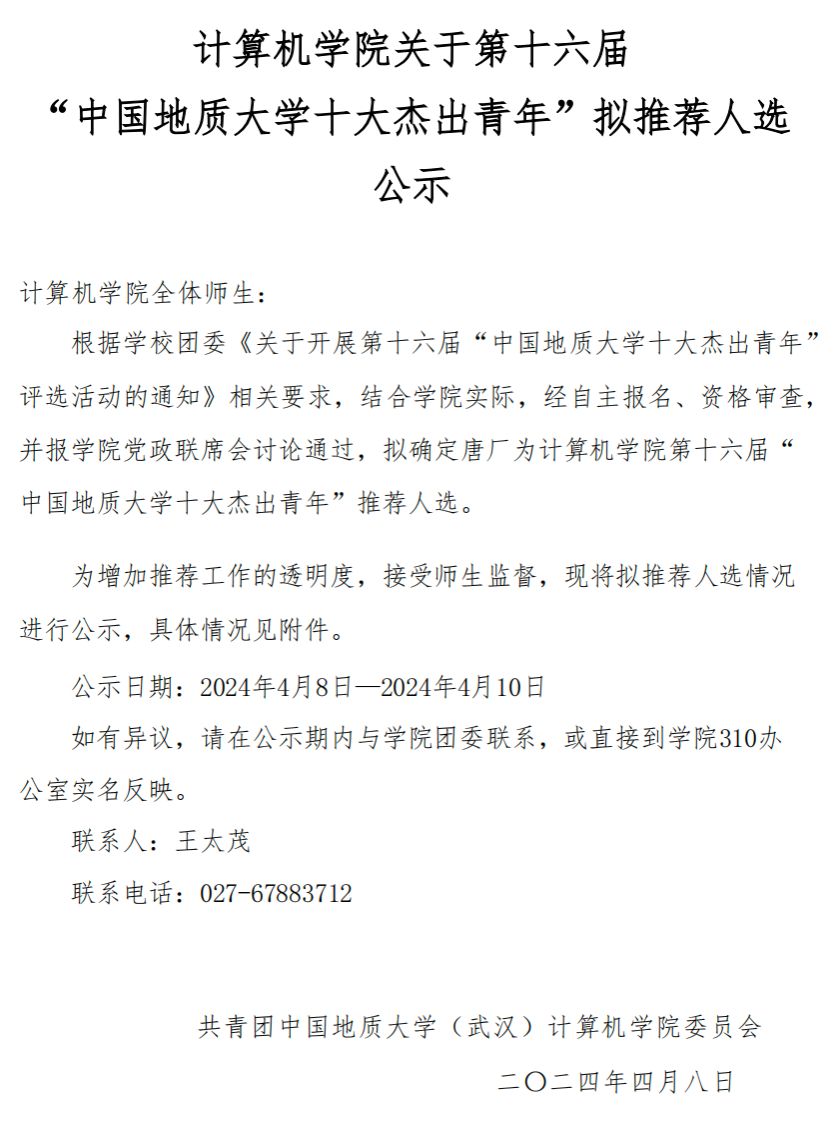世界杯体育官方网站关于第十六届“中国地质大学十大杰出青年”拟推荐人选公示