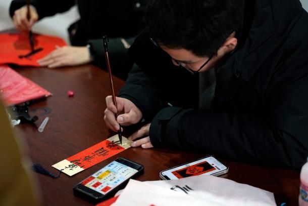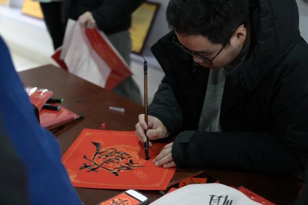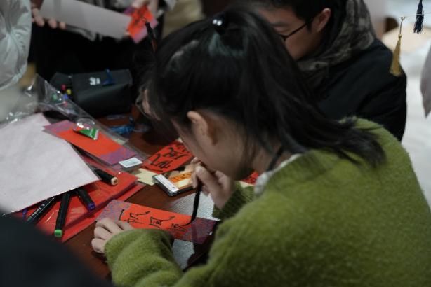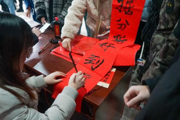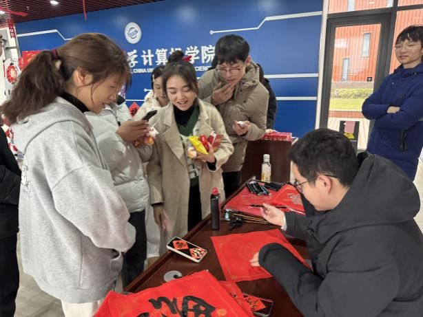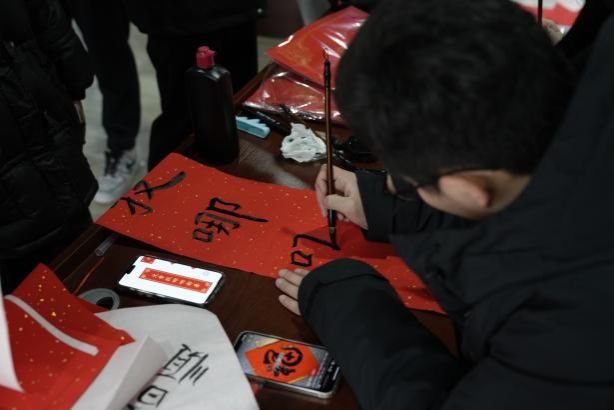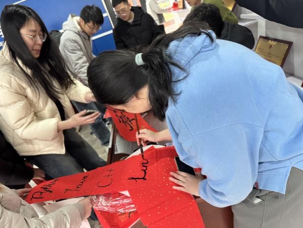 挥毫泼墨,体验书法艺术的妙趣横生! 活动现场,既可以获得书法“大咖”马浩正师兄定制的书法“墨宝”,也可以亲自感受行云流水般的肆意畅快,拿起毛笔,蘸墨挥写,感受笔尖与纸面的亲密接触,一笔一画都传递着书法的力量与美感。同学们也结合专业特色,写下计科人对于新年的美好祝福和祈愿!