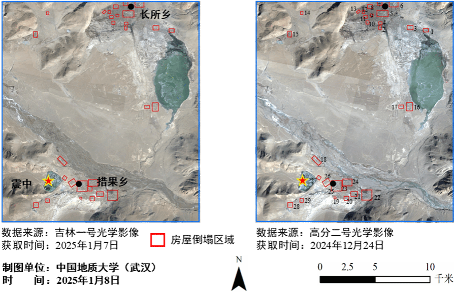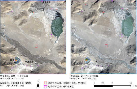 王力哲教授团队第一时间启动应急响应机制。团队成员争分夺秒,运用国产高分遥感卫星数据,以震中为中心,对措果乡和长所乡等损毁重点区域开展了遥感数据处理和区域地质环境、房屋倒塌、道路损毁等解译工作。