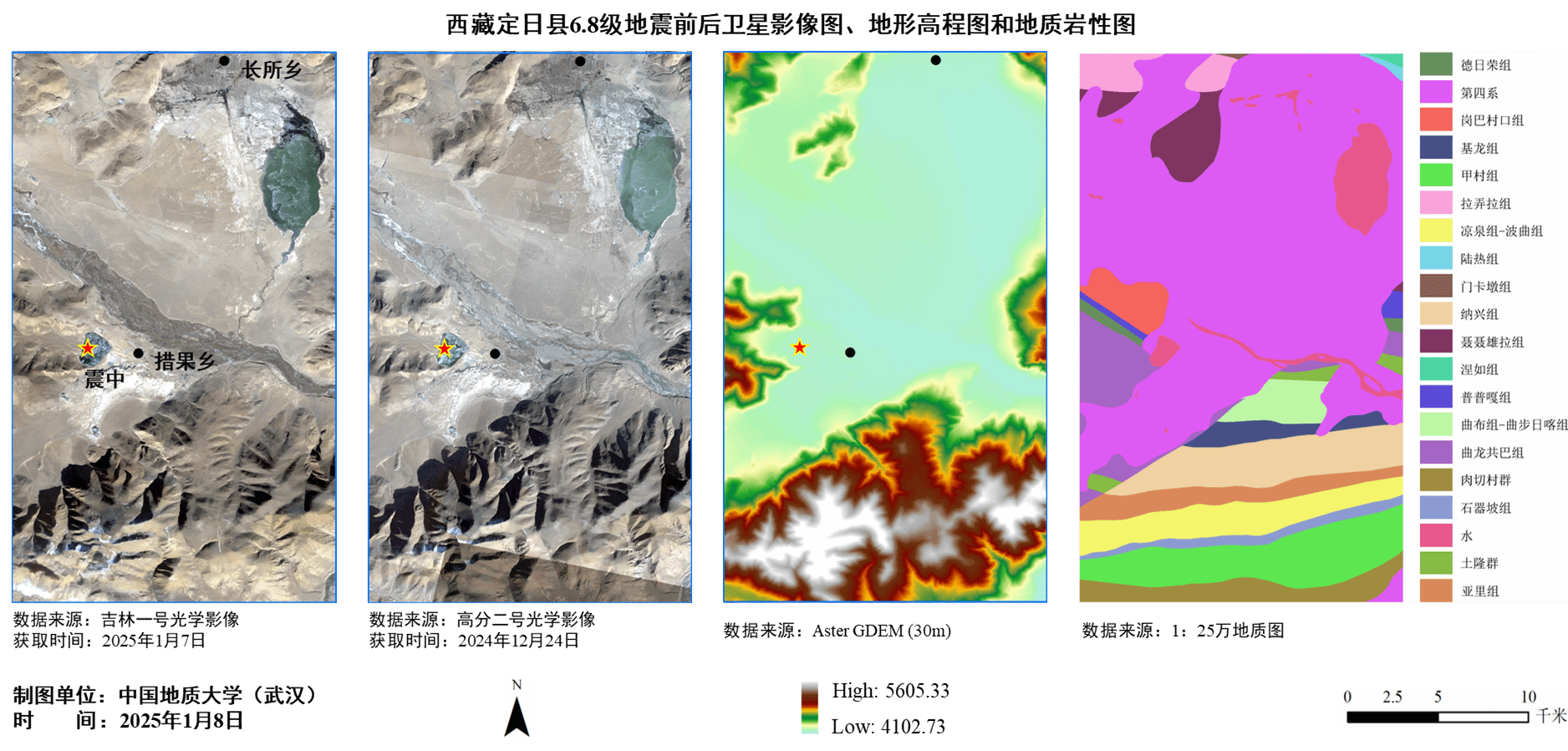 一是解译出了西藏定日县6.8级地震前后卫星影像图、地形高程图和地质岩性图(下图)。图中地震前后影像图,可用于房屋倒塌、道路损毁解译,助力快速评估受灾范围及程度。地形高程图和地质岩性图,可用于分析区域内地形地貌和地质条件,为灾害评估提供数据支撑。