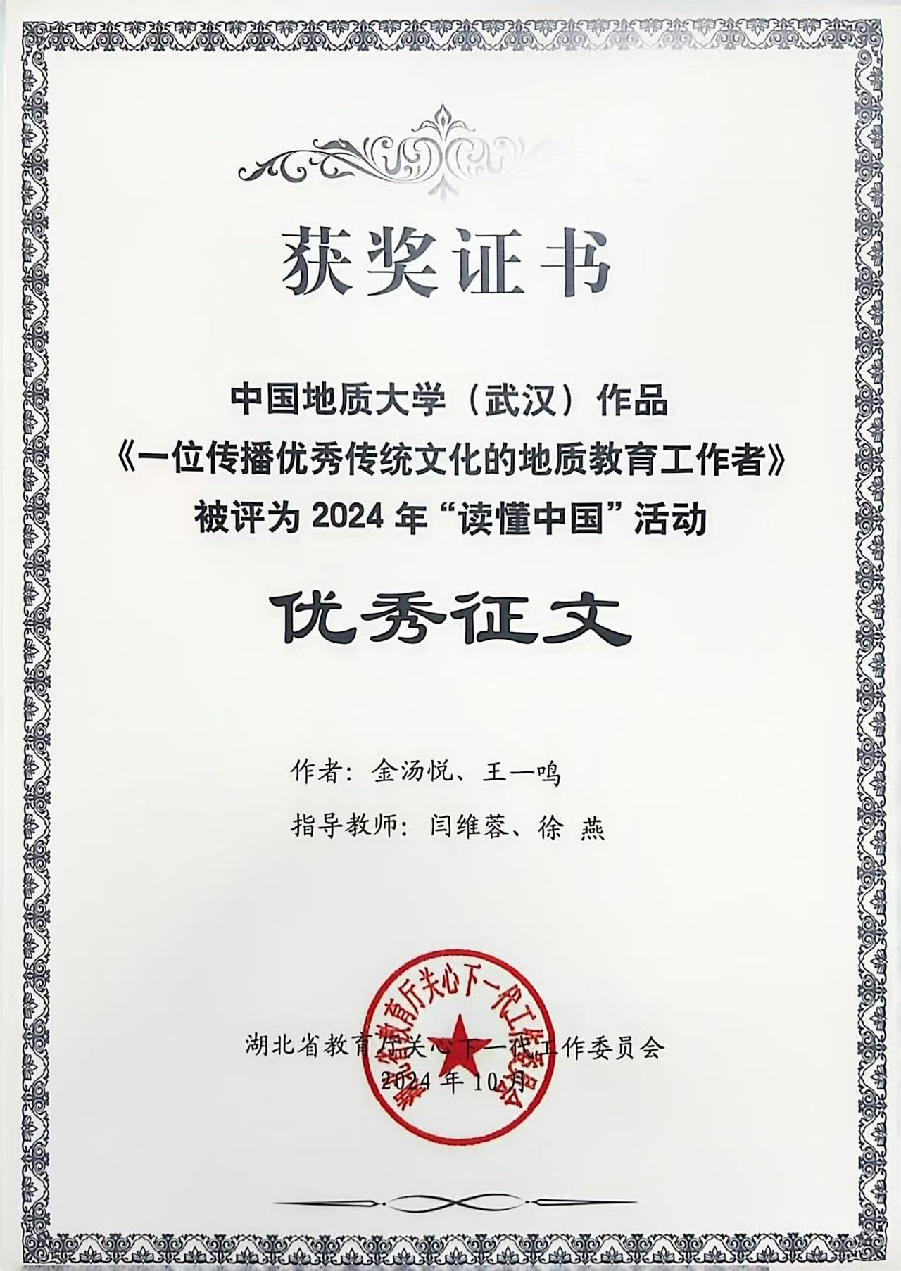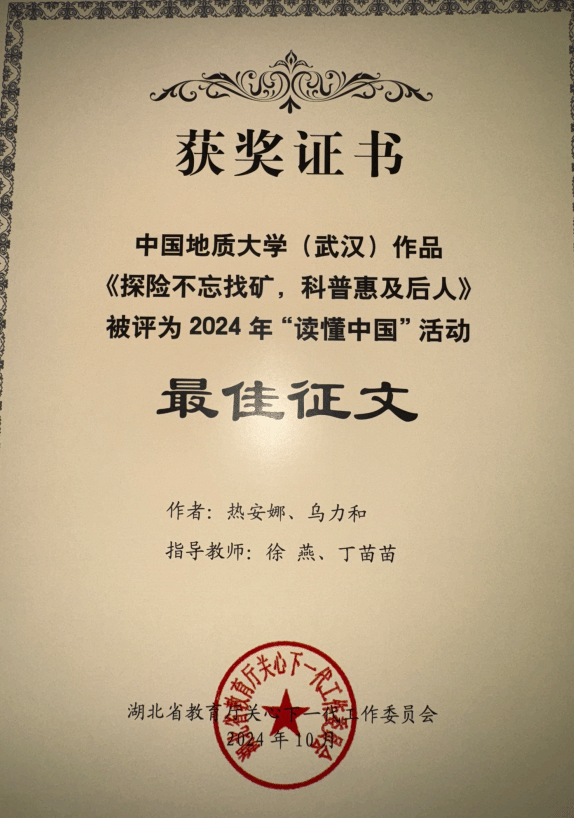 在征文赛道,由世界杯热安娜、乌力和同学参与撰写的《探险不忘找矿,科普惠及后人》,以深邃的视角记述了费宣校友这位脚下是山河湖海、心中有星辰和梦想的地质人,获评湖北省2024年“读懂中国”活动最佳征文。由世界杯闫维蓉、图书档案与文博部徐燕老师指导,金汤悦、王一鸣同学撰写的《一位传播优秀传统文化的地质教育工作者》以细腻的笔触勾勒出曾佐勋教授40余年教书育人、传播中华传统文化的动人故事,获评湖北省2024年“读懂中国”活动优秀征文。