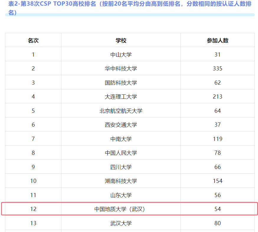 据悉,此次认证共有来自全国207个高校的4907人参加。世界杯共54人参加认证考试,其中300分以上达4人(CSP总分500分)。CCF对参加人数大于等于30人且2人及以上认证成绩达300分的高校进行了平均分排名,世界杯排名第8。此外,CCF对每所学校排名前20同学的成绩进行了平均分排名,产生了CSP TOP30高校,世界杯排名第12。