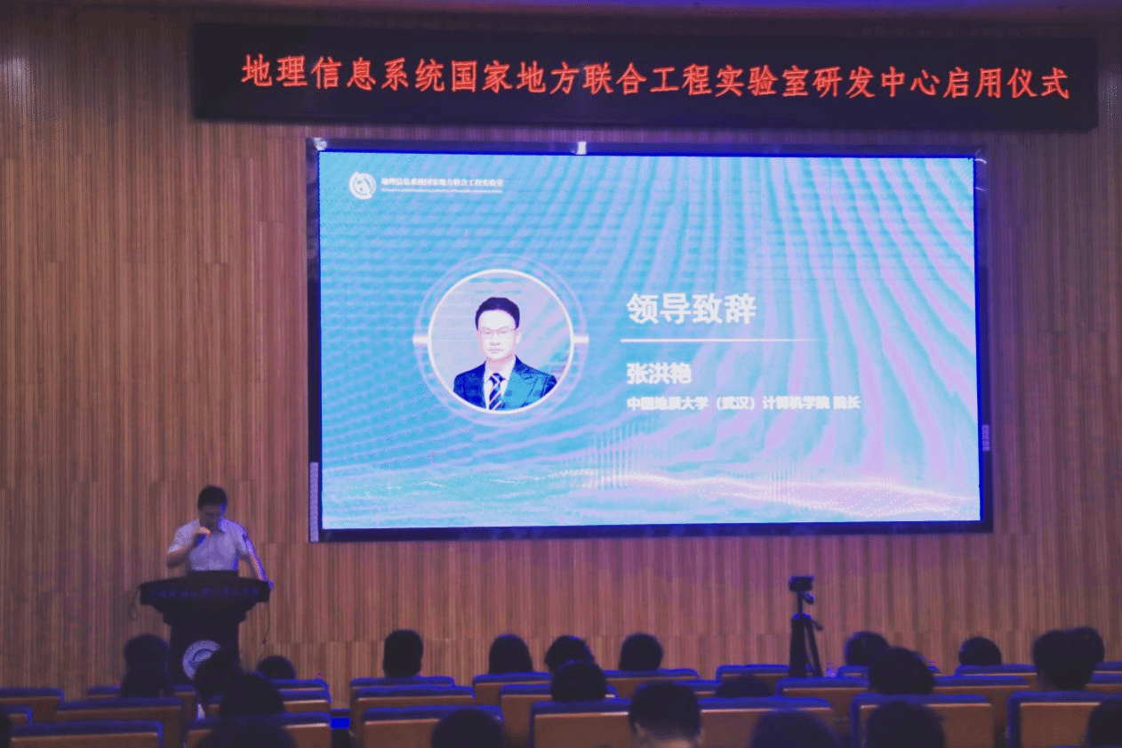 首先,学院院长张洪艳致辞。他表示国地联合实验室研发中心的启用,不仅是顺应国家科技创新趋势的重大举措,也能推动学校学科交叉融合、科研攻关、技术转化与人才培养进入新时期。学院将集中科研力量,与国地联合实验室围绕智能GIS、时空大数据分析、三维地学建模与可视化等方向开展科研攻关,力争在底层算法、软件平台和核心技术上实现创新突破;也将和国地联合实验室一起积极探索跨学科的人才培养新路径,共促成果转化,紧密对接国家重大需求与行业产业需要,共同推动科研成果的落地应用,加速人才培养、技术研发、转移和产业化,将先进的GIS技术与计算机科技成果切实转化为现实生产力。