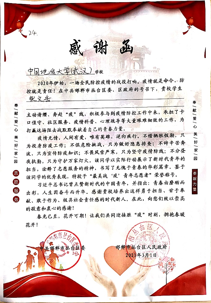 (通讯员:陈宝华)“疫情就是命令,防控就是责任!在中共邯郸市丛台区委、区政府的号召下,贵校学生柴文岳主动请缨,奔赴‘疫’线,积极参与到疫情防控工作中来,承担了卡口值守、社区服务、疫情科普、心理疏导等大量艰难细致的工作,为打赢这场阻击战默默奉献着自己的青春力量……”近日,世界杯体育官方网站收到一封中共邯郸市丛台区委、邯郸市丛台区人民政府发来的感谢函,对世界杯体育官方网站191191班柴文岳同学在疫情防控期间的志愿服务表示感谢,授予他“最美战‘疫’青年志愿者”荣誉称号。