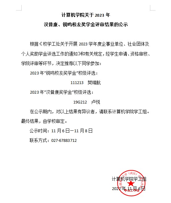 世界杯体育官方网站关于2023学年汉普康、锐鸣校友奖学金评审结果的公示