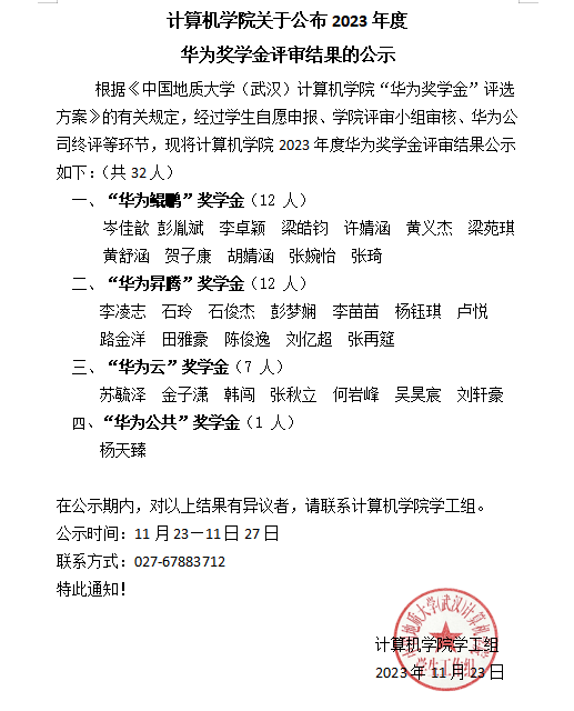 世界杯体育官方网站关于公布2023年度华为奖学金评审结果的公示
