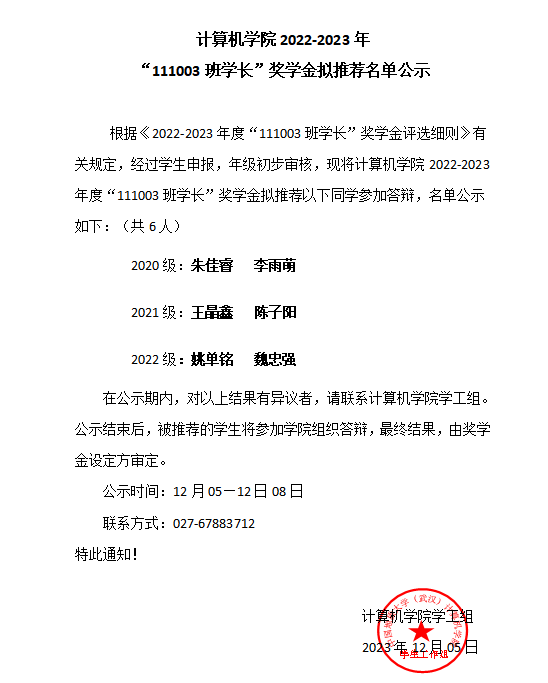 世界杯体育官方网站2022-2023年“111003班学长”奖学金拟推荐名单公示