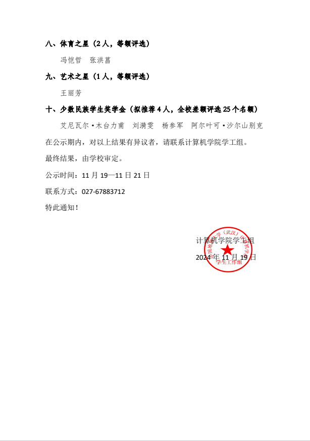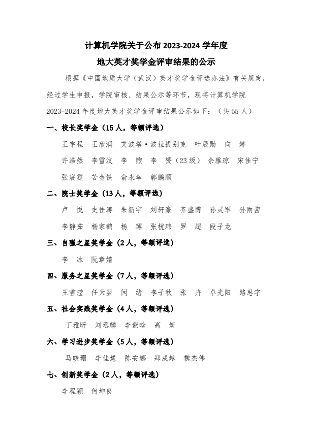 世界杯体育官方网站关于公布2023-2024学年度地大英才奖学金评审结果的公示