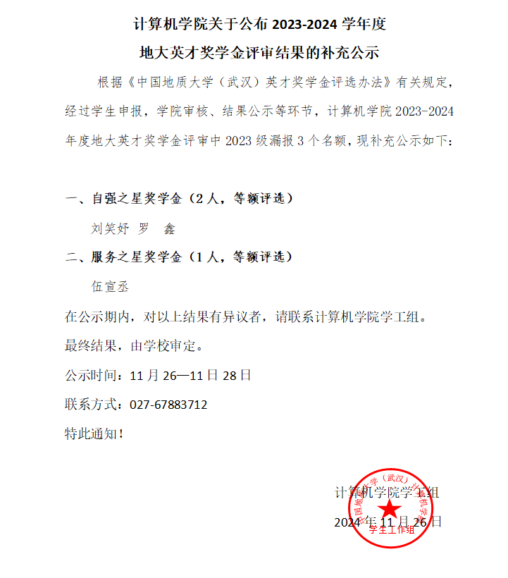 世界杯体育官方网站关于公布 2023-2024 学年度地大英才奖学金评审结果的补充公示