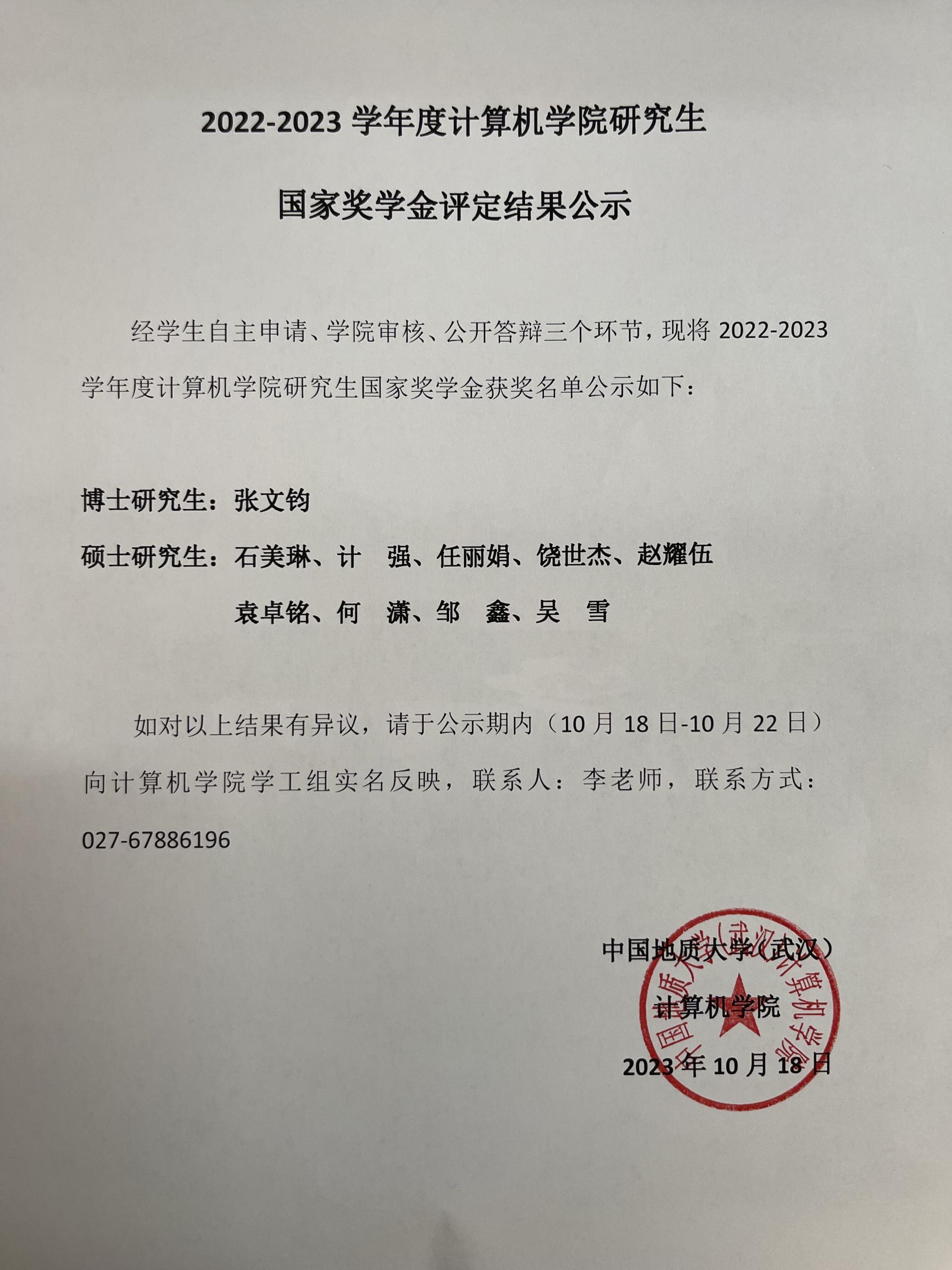 2022-2023学年度世界杯体育官方网站研究生国家奖学金结果公示