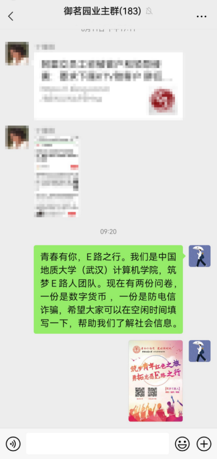 志愿服务之余,“筑梦E路人”团队热情地邀请社区居民扫码填写“数字货币”与“防电信诈骗”线上问卷,面向社会继续扩大问卷覆盖范围,积累数据,为团队后期分析问卷,撰写报告,解决问题奠定基础。