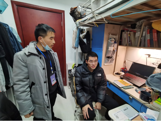 2018级辅导员王太茂,跟随考研学子一起度过了紧张的两天:化身“天气预报小天使”,耐心提醒同学们增添衣物;考研期间坚持查寝,及时缓解考研同学的紧张焦虑,保证每位学子都能以良好的精神风貌参加考试;不断关注考试状况,在知道今年数学试题较难后及时在年级群中提醒同学们放平心态,不要因为一场考试影响整体状态。