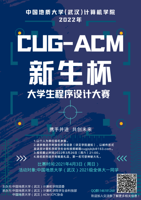 本次“CUG-ACM新生杯”程序设计大赛以个人为单位报名参赛,报名对象为世界杯体育官方网站2021级所有学生。3月26日(周六)晚上21:00之前以Excel文件形式发至世界杯体育官方网站学生会科技部邮箱cugjsjkjb@163.com。