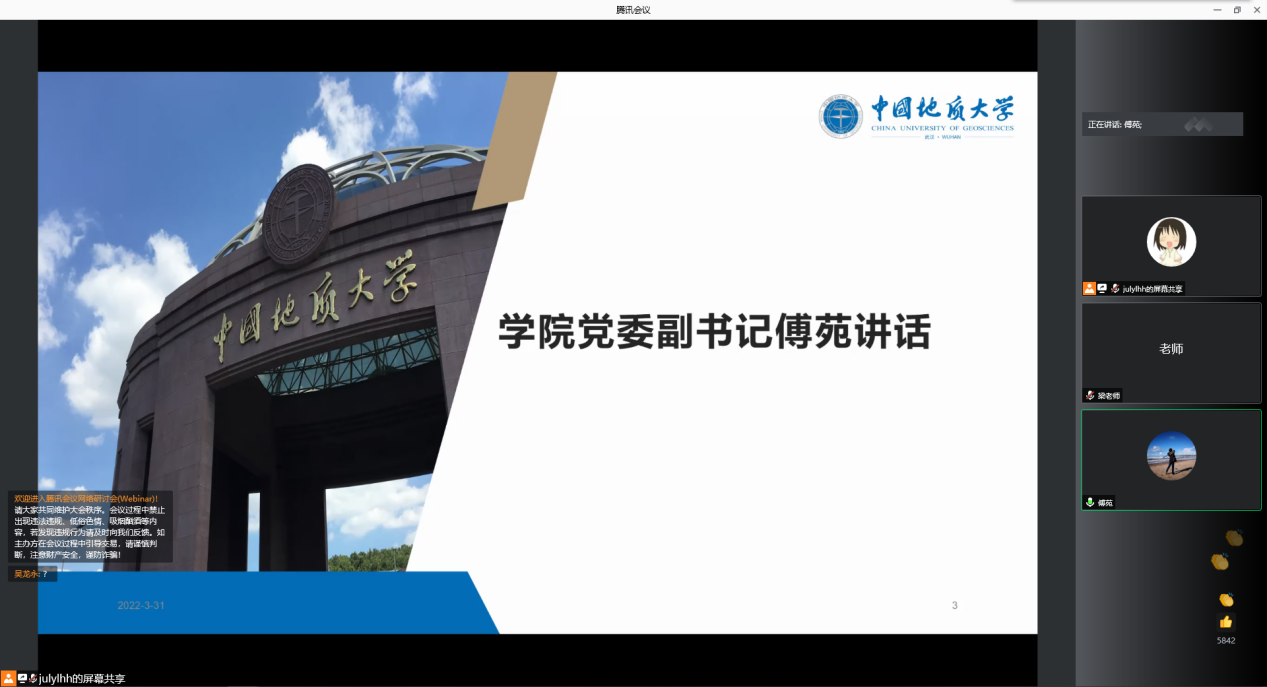 首先,傅苑从日常科研学习切入,叮嘱同学们抓住学习机遇,保持对科研的敏感度,秉持良好的学习习惯和科研态度,通过各类科研项目实践提升自身学术科研水平。当前,常态化疫情防控不能松懈,广大研究生要严格遵守各项管理规定,合理安排科研学习与个人职业发展,积极参与学院组织各类综合素质能力成长活动,主动拓宽信息来源。最后,她提醒同学们要谨防电信诈骗,健康生活,快乐生活。