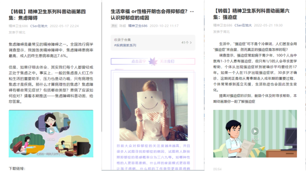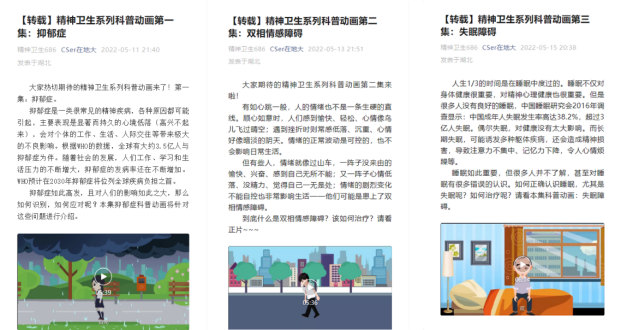 为加强同学们对心理健康知识的了解,在心理健康宣传月中,世界杯转载了“精神卫生系列科普动画”共计六集,转载分享了抑郁症成因和焦虑自助等科普文章。本系列科普视频和文章的传播,为心理健康宣传月塑造了良好的氛围。