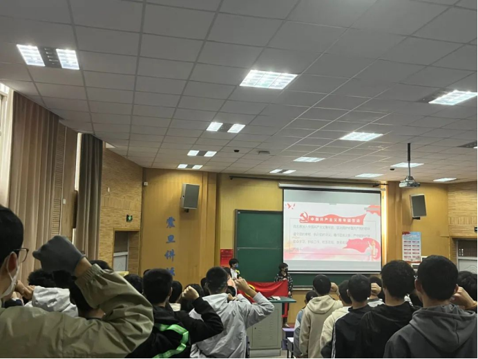 在团日活动开始之前,全体起立奏唱中国共青团团歌,随后主持人郭洋利宣布本次团日活动正式开始。郭洋利紧扣中国共产党精神之源,并以“中国共产党第二十次全国代表大会”部分场景切入本次团会主题:弘扬伟大建党精神,阐述过去五年的工作和新时代十年的伟大变革。