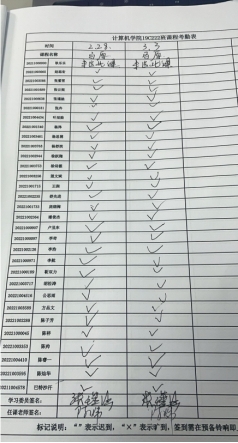 “叮——”同学们的手机齐刷刷地收到消息,原来是学委发布了线上签到。通过学习通的定位功能,计科学子们用线上点名的方式完成课堂考勤——到课率100%。2022级本科生针对课堂考勤进行了详实的记录,课堂上也会有辅导员进行课堂点名的身影。