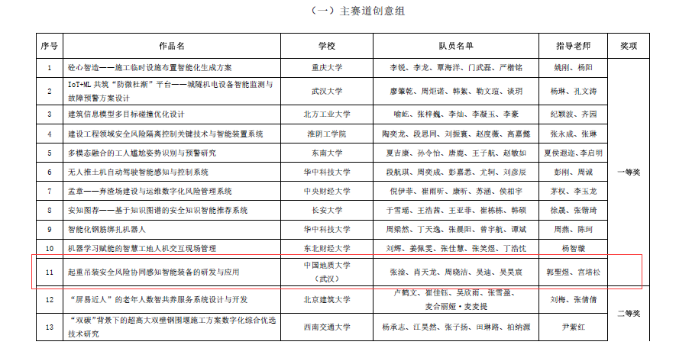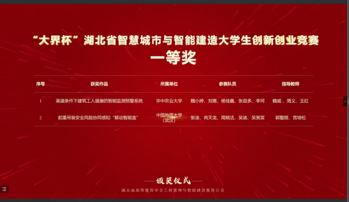 据悉全国智慧城市与智能建造大学生创新创业竞赛是当前工程管理领域影响力最大、影响范围最广的学科竞赛。本次比赛,世界杯体育官方网站2021级本科生吴昊宸与经济管理学院工程管理专业组成联队(团队成员:张淦、肖天龙、周晓洁、吴迪、吴昊宸),以参赛作品“起重吊装安全风险协同感知智能装备的研发与应用”(指导老师:郭聖煜、宫培松)进入决赛,最终从大赛主赛道来自98所高校的107支队伍的参赛作品中脱颖而出,荣获一等奖。此前在“大界杯”湖北省智慧城市与智能建造大学生创新创业竞赛中,该参赛作品已经获得一等奖。