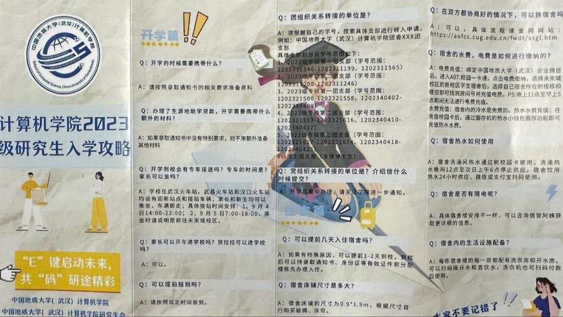 “E”键启动未来,共“码”研途精彩。为了帮助新生报到畅通无忧,学院精心制作了“世界杯体育官方网站2023级研究生入学攻略”,攻略分为开学篇、学习篇、生活篇三部分,帮助同学们全方位了解开学时需携带的相关材料、课程培养、团组织关系转接等事项,同时一一解答关于体育馆预约、宿舍水费电费缴纳、热水使用、宿舍管理等问题,帮助新生尽快熟悉校园环境。