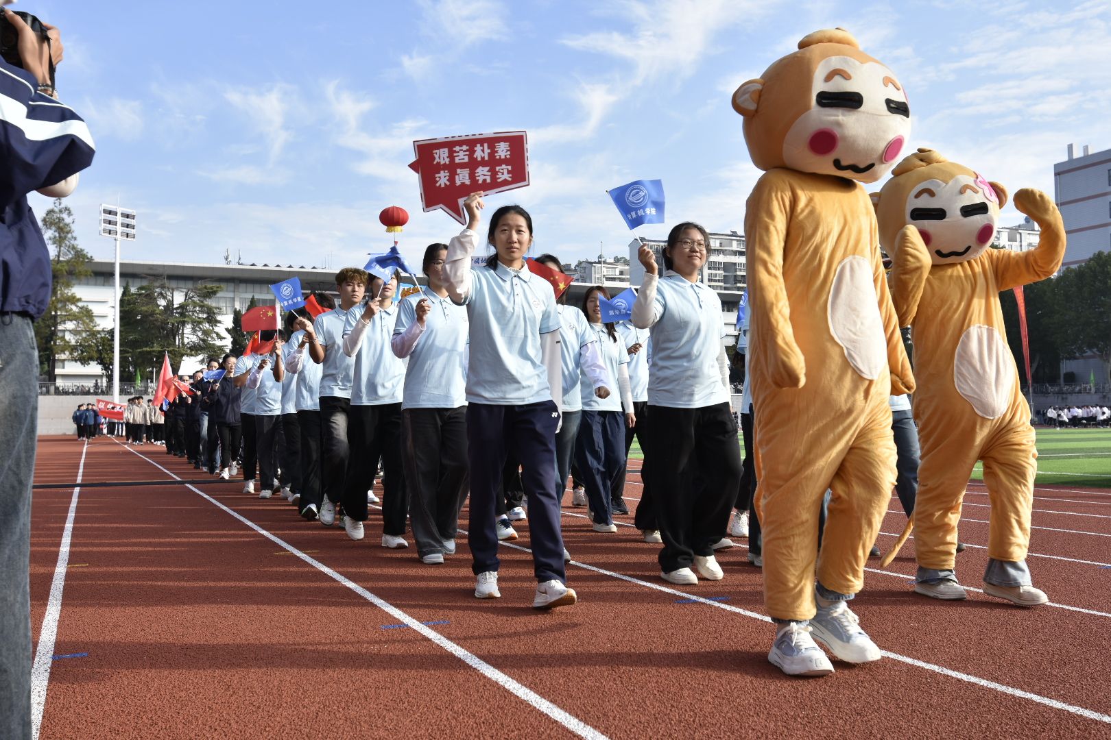 乐声激昂,步伐铿锵。世界杯体育官方网站方阵以矫健的身姿步入赛场,尽显青春的蓬勃朝气。那整齐划一的步伐,每一步都踏在激昂的鼓点上,仿佛是代码精准运行的节奏,彰显着学院学子严谨而又充满活力的精神风貌。队伍前方,领队高擎院旗,意气风发;方阵之中,同学们手持国旗与院旗,笑容自信,气宇轩昂。“代码为锋,赛场称雄”——嘹亮的口号划破长空,回荡在整个运动场上。队伍两侧,两只活泼可爱的“程序猿”随着节奏欢快律动,为庄严的开场注入轻松与惊喜。学院的教职工们也并肩同行,他们展现出讲台之外的别样风采,以身体力行的方式诠释着团结协作、奋勇拼搏的精神,让整个方阵充满了凝聚力和向心力。