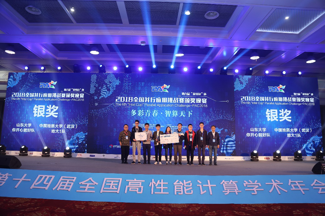 10月20日,国内两大超算赛事——第六届全国并行应用挑战赛(PAC2018)和第二届国产CPU并行应用挑战赛(CPC2018)在青岛国际会展中心落下帷幕。我校世界杯体育官方网站高性能计算导师团队(王力哲、张锋、武进霞、董理君)联合指导的两支代表队,从全国四大赛区168支参赛队伍中突围进入16强决赛,与来自清华、中科大、中科院、上海交大、中山大学、山东大学、中国海洋大学、香港中文大学等单位的决赛队伍同场竞技,最终地大之光超算1队(雷辛亚、郭睿欣、马永耀、薛尔康)在PAC优化赛道中以季军的成绩获得银奖和1万元奖金;地大之光超算2队(李瑞、张晓涵、董宇、姜家伟)以全国16强的成绩分获CPC和PAC中南赛区一等奖和4千元奖金。