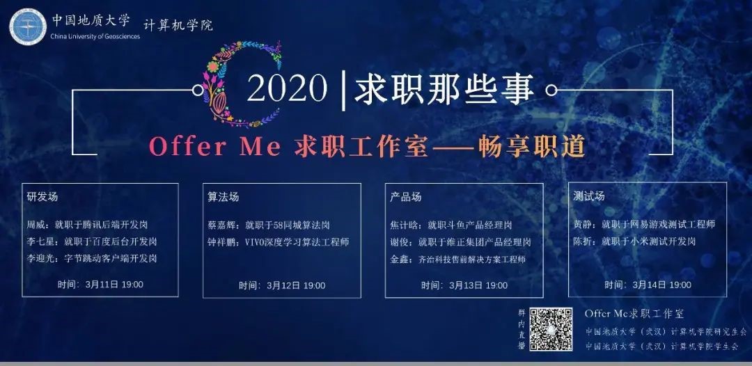 3月11日至3月14日晚,世界杯体育官方网站研究生会“offer me 求职漫谈”经验分享系列活动成功举办。疫情当前,停课不停学,隔离不隔爱。活动共邀请11位学长学姐在线分享求职经验,并深入讲解和剖析求职技巧。