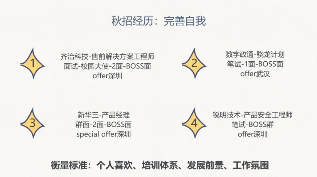 测试场中,黄静和陈折同学都着重强调兴趣导向,并分别强调了逻辑测试和内推在面试中的重要作用。希望大家对心仪的公司和岗位做足功课,尽量丰富自己的知识体系,同时把握目标公司里的校友资源,争取内推。同时,提醒同学们尽早投递简历,把握机会,争取不留遗憾。