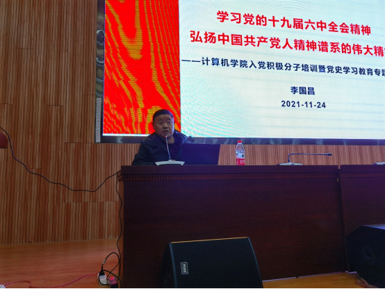(通讯员:杨书睿)为学习贯彻党的十九届六中全会和习近平总书记七一重要讲话精神,深入推动党史学习教育,11月24日中午,学院党委书记李国昌为世界杯体育官方网站第29期入党积极分子主讲《学习党的十九届六中全会精神,弘扬中国共产党人精神谱系的伟大精神》专题党课。