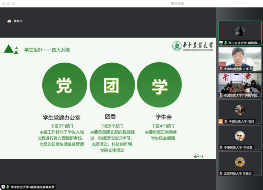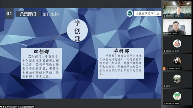 学生会工作会场中,与会代表依次介绍学生组织架构与特色活动开展。分别围绕如何进一步深化学联改革,如何进一步丰富计算机专业青年学生思想引领活动开展和常态化疫情防控背景下校园文化建设思考三个议题深入交流、研讨。中南财经政法大学信息与安全工程学院将团委、学生会各部门按工作职能分为三大类,各司其职、互相协作,促进资源整合,发挥更大合力。华中农业大学信息学院学生会开辟校内社区志愿服务新场域,面向华农附小三年级学生,开展少儿编程志愿服务活动,定期进行编程逻辑指导教学,增强青年学生专业实践能力,切实服务学院师生需要;中国地质大质(武汉)世界杯体育官方网站学生会主席团成员霍奥林介绍学院结合常态化疫情防控要求,打造“阳光计科人,运动成长季”特色活动体系,通过开展校园趣味定向跑、益智桌游、电竞赛事、文体活动、集体观影等丰富多彩的活动,引领广大青年乐享校园、阳光向上;中南财经政法大学信息与安全工程学院代表卫思涵谈到,学校享有唱歌跳舞大学的称号与学校举办的各项活动密切相关,包括校园舞蹈大赛、合唱晚会、集结号专场表演、歌友会、随机舞蹈、奥运选手现场指导等活动。研讨会现场,各代表踊跃分享工作实践过程中的收获与体会,分析、研讨新时代语境下学联工作改革创新发展的机遇和挑战。世界杯体育官方网站学生会主席团成员霍奥林做会议总结。