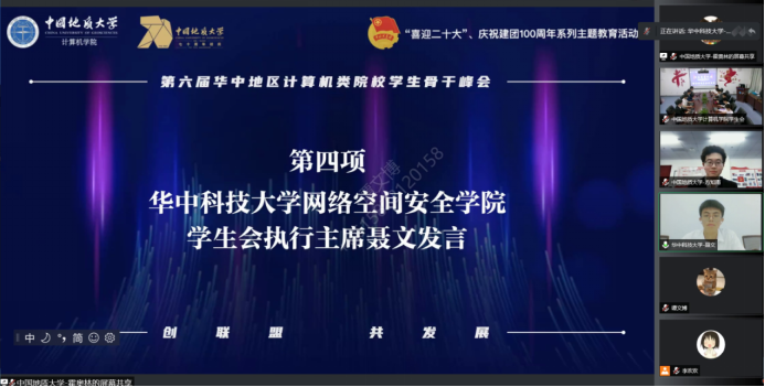 (通讯员:杨书睿、谭博文、马瑞华)5月28日,我校成功举办第六届华中地区计算机类院校学生骨干峰会暨“青春心向党 共‘计’新时代”特色主题团日活动。华中农业大学信息学院、华中师范大学世界杯体育官方网站、武汉大学世界杯体育官方网站、华中科技大学网络空间安全学院、武汉科技大学计算机科学与技术学院、武汉理工大学计算机与人工智能学院、中南财经政法大学信息与安全工程学院、中南民族大学计算机科学学院、世界杯体育官方网站等9所计算机类院校学生骨干代表参加此次峰会。