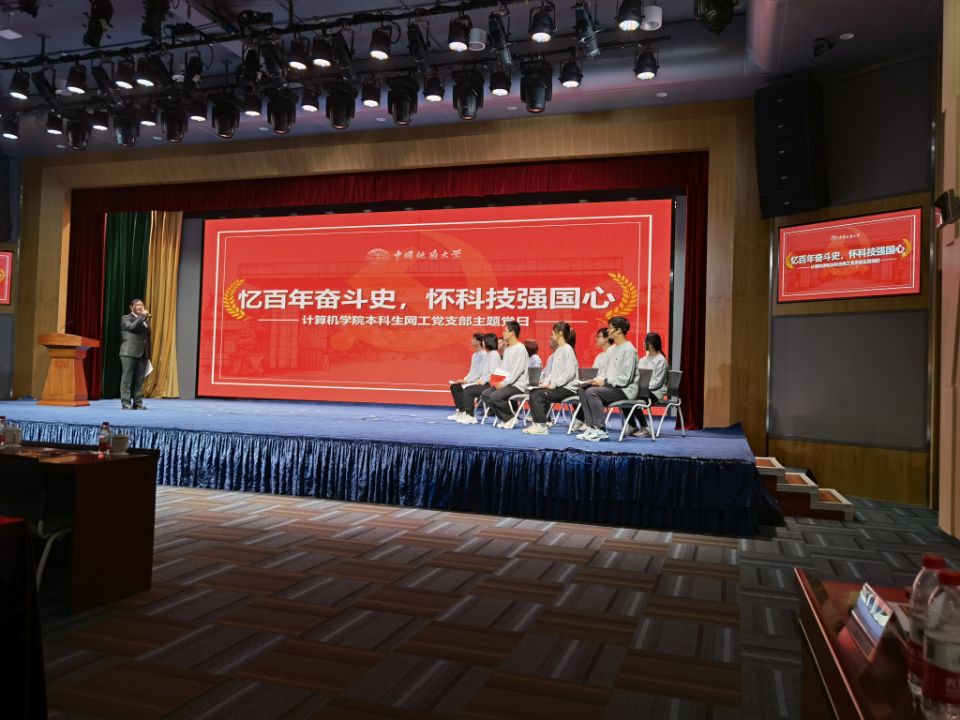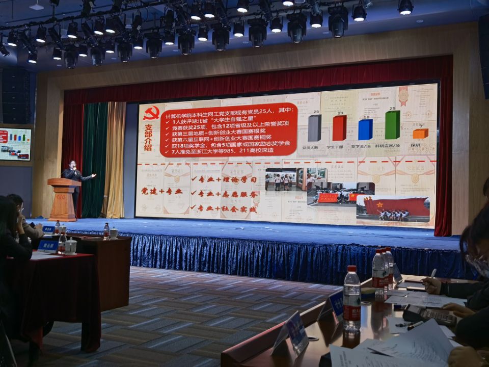 决赛前的彩排让整个队伍倍感压力,其他党支部都带来各具特色的展示,朗诵、话剧表演、作品展等令人目不暇接,队伍的信心一度跌落谷底。但是傅苑老师亲切的鼓励让所有成员重新振作,“大家能够展现用计科专业知识服务社会的、人无我有的特色,就是一次成功的展示”。就这样,队伍自信地站上了决赛的舞台,以饱满的热情和精气神完成了三个环节的比拼。