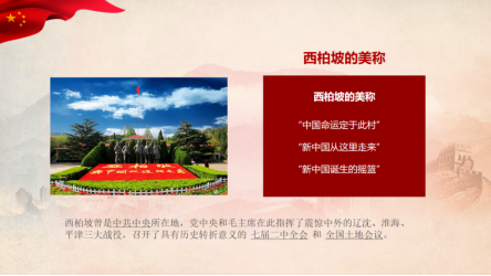1927年8月1日,南昌起义在全国人民面前树立了一面鲜明的武装斗争旗帜,充分地表现了共产党员和中国人民不畏强敌、前仆后继的革命精神;1935年1月15日至17日,遵义会议确立了以毛泽东为代表的新的中央的正确领导,是中国共产党生死攸关的转折点,是中国共产党从幼稚走向成熟的标志;西柏坡革命圣地作为我国最具有标志性意义的五大革命圣地之一,党中央和毛主席在此指挥了震惊中外的辽沈、淮海、平津三大战役……