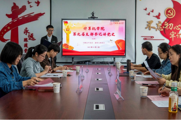 通过团支部书记讲述党的百年奋斗史和学校发展史,宣传党和国家事业以及学校取得的历史性成就、发生的历史性变革,让同学们更加知史爱党、知史爱国、知史爱校,坚定理想信念,厚植爱国爱校情怀。新时代的地大计科人要不负时代重托、不负党的期待、不负人民所望,坚定信念、提振信心、增添力量,在新征程中激扬青春,让青春之花在祖国和人民最需要的地方绽放。
