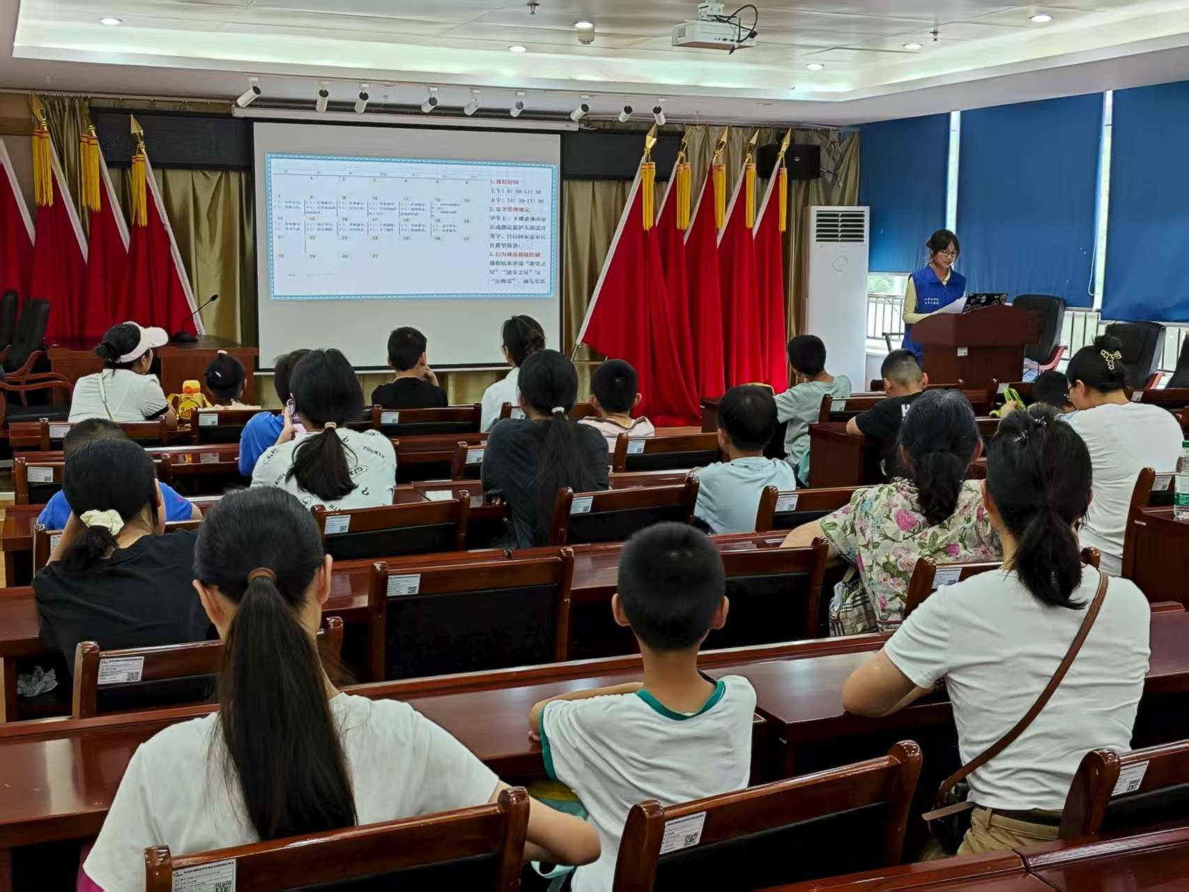 伴随着朝阳的升起,社区青少年与家长们齐聚现场。在简约而有序的布置中,开班仪式如期举行,为接下来的两周志愿托管服务吹响了启航的号角。